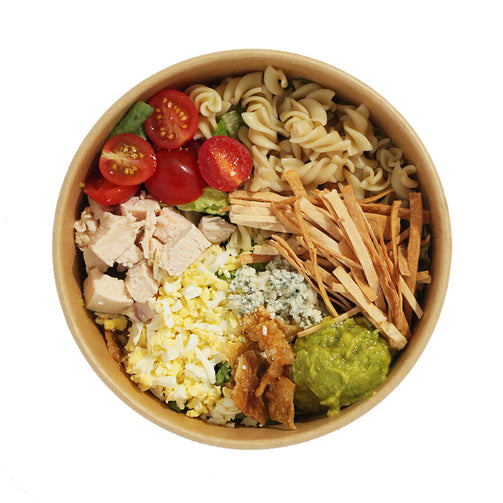 MED’s hearty twist on the traditional Cobb Salad with Romaine Lettuce, Fusilli Pasta, Poached Chicken, Chicken Skin Bac’n, Grated Eggs, Cherry Tomatoes, Mashed Avocado, Pita Srips, Bleu Cheese, and our Signature Ranch Dressing.