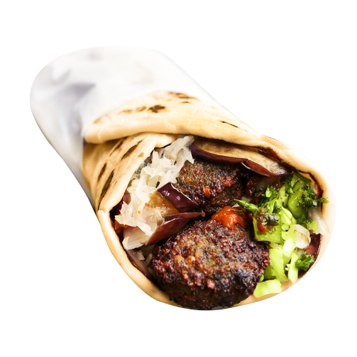 Crunchy falafel in a 12" house-baked Laffa bread, stuffed with mixed greens, israeli salad, fried eggplant, matbukha, sauerkraut and the sauce of your choice.