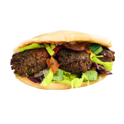 Crunchy fried falafel in a 6" house-baked pocket pita bread, stuffed with mixed greens, israeli salad, fried eggplant, matbukha, sauerkraut and the sauce of your choice.