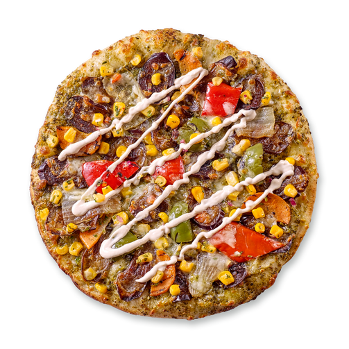 Basil pesto base, topped with mozzarella, grilled vegetables, corn salad, spinach and fried eggplant.