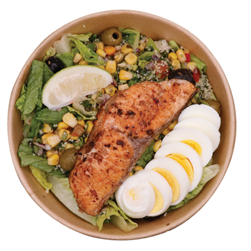 Grilled salmon fillet, romaine, tabbouleh, marinated mized olives, corn salad, hard boiled egg, and lime wedge.