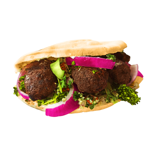 Juicy, char-grilled beef kofte in a 6" house-baked pocket pita bread, stuffed with mixed greens, tabbouleh, hummus, sumac onion and the sauce of your choice.